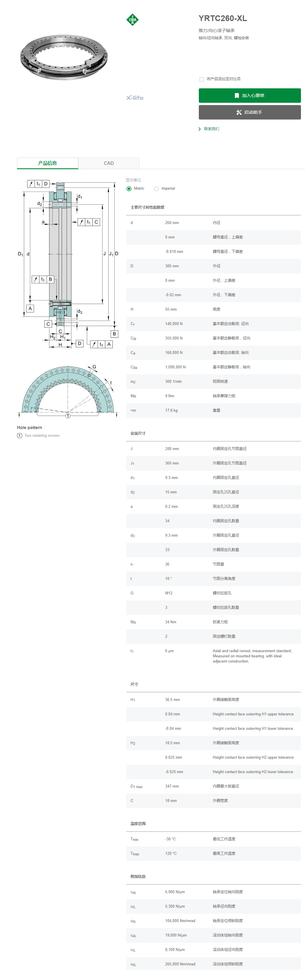 INA 轉臺軸承YRTC260-XL尺寸參數
